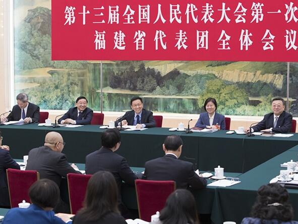 3月8日上午,参加十三届全国人大一次会议的福建代表团在人民大会堂福建厅举行全体会议,继续审议政府工作报告,审查计划报告和预算报告,推选监票人。中共中央政治局常委韩正参加福建代表团审议。