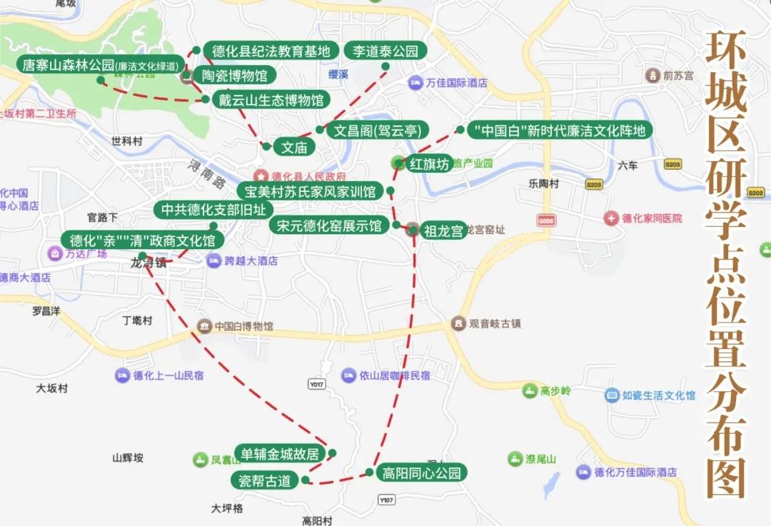 龙浔镇范围:中共德化支部旧址→德化“亲”“清”政商文化馆→单辅金城故居→瓷帮古道→高阳同心公园→祖龙宫→宋元德化窑展示馆→宝美村苏氏家风家训馆→红旗坊→“中国白”新时代廉洁文化阵地。