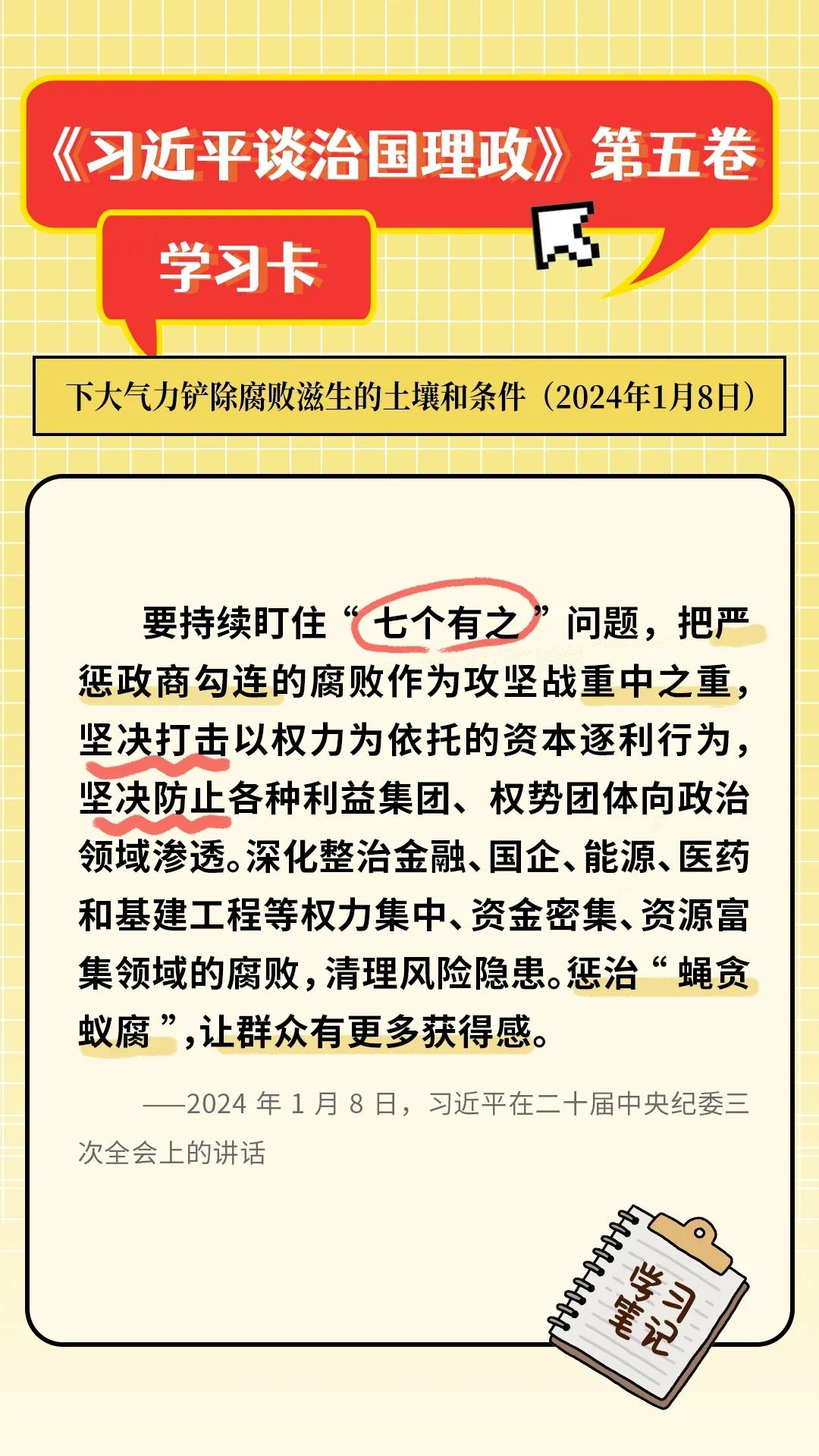 学习进行时丨警惕“七个有之”! 2025-12-22 10:55:53 来源:共产党员微信-灯塔党建在线 下大气力铲除腐败滋生的土壤和条件,是《习近平谈治国理政》第五卷深入论述的开展反腐败斗争的根本之道。持续保持惩治腐败高压态势,盯住“七个有之”问题、高悬惩治利剑,更是我们持续发力、纵深推进反腐败斗争的关键战略部署。那么“七个有之”具体指的是什么问题呢?一起来了解。