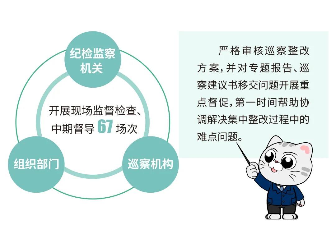 探索巡察整改监督纪实制度,全程跟进巡察反馈意见整改,出台巡察整改联合会审工作实施办法,加强对整改疑难复杂问题联合会审,先后发出巡察整改提示函、纪检监察建议书49份,集中整改期满的65个单位完成反馈问题整改率达98.35%。